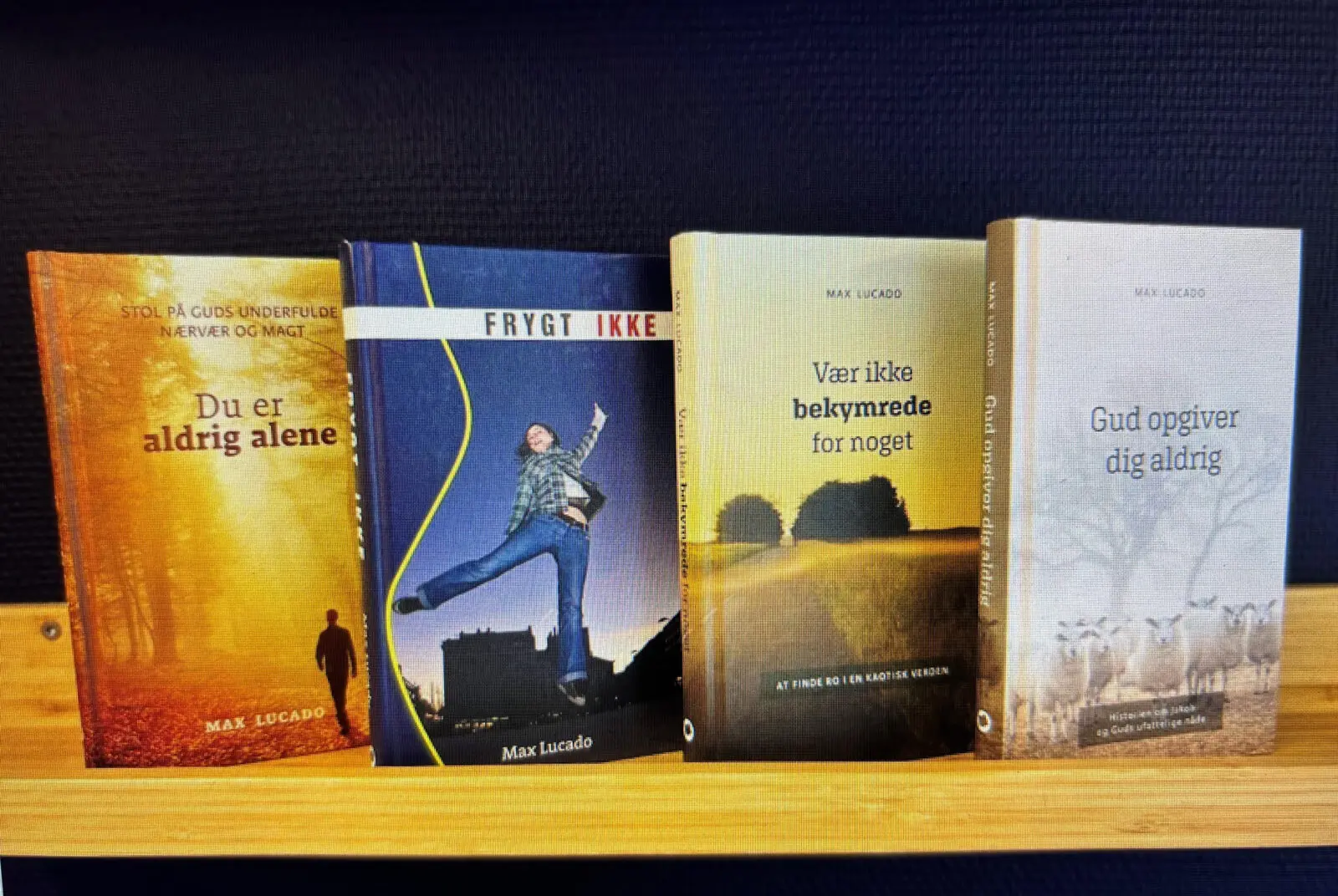 Í høllini verður stórt bókaborð. Millum annað verða hesar bøkur, sum Max Lucado hevur skrivað.