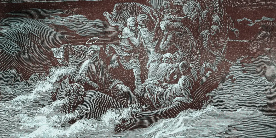 Meðan Jesus og lærisveinarnir sigla yvir um Galileavatnið, brestur ein ódn á. Lærisveinarnir eru ræðslusligin, men Jesus svevur í friði. Og hann fór upp og hótti at vindinum og segði við vatnið:: “Tig, ver kvirt!!”