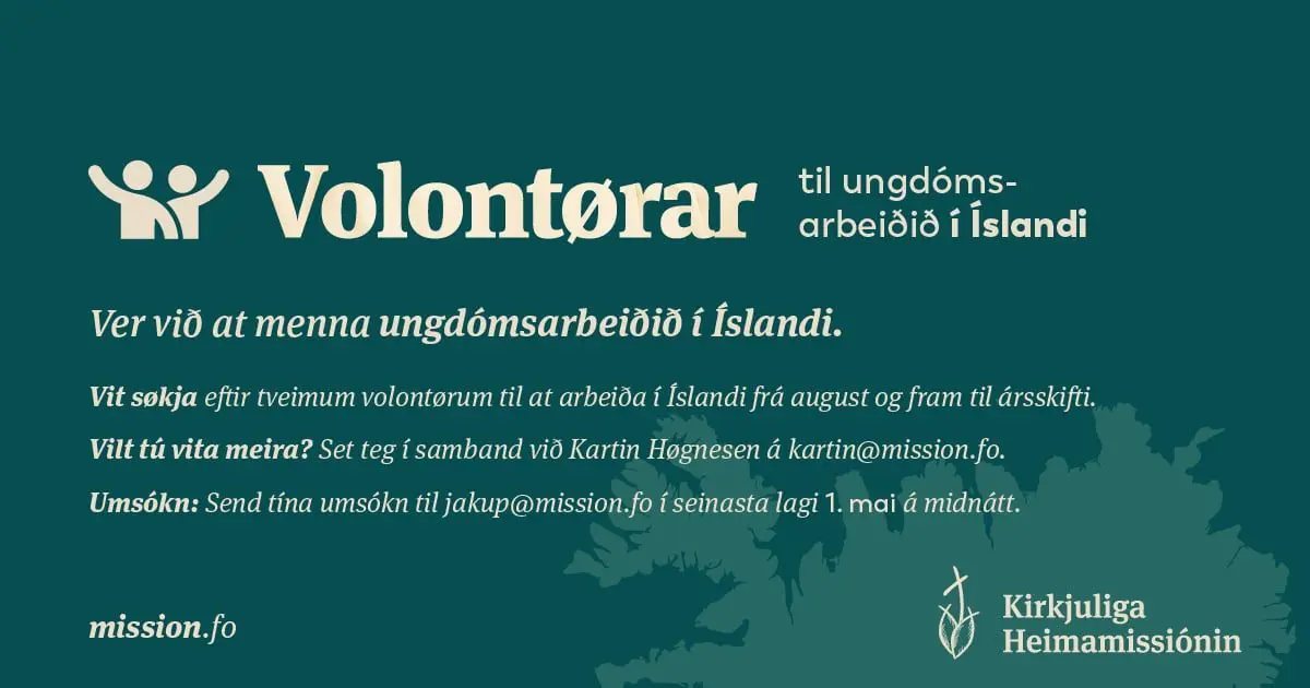 Kirkjuliga Heimamissiónin leitar nú eftir nýggjum volontørum til spennandi og mennandi arbeiðið í Íslandi frá august og fram til ársskifti.
