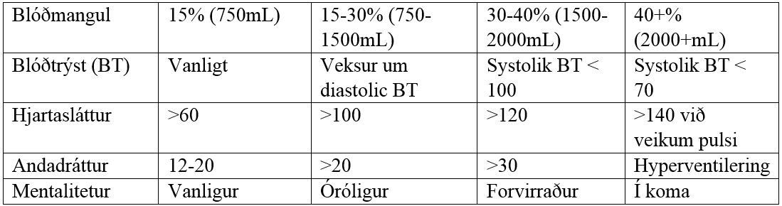 Hjartaslátturin er vanligur í byrjanini, tað er 60 og hægri um minuttin. Tað er hvílipulsurin hjá persóninum. Men so skjótt ein missur meira enn 15% av blóði, vaksur pulsurin ógvuliga skjótt, hann endar á 140, og sum greitt frá áðrenn er lítið og onki trýst fyri hvørt slag. Fylgjurnar av hesum eru, at tað verður lagt meira trýst á gøgnini og ikki minst hjartað. Tað kann enda við kolapsi og so hevur ein hjartasteðg.