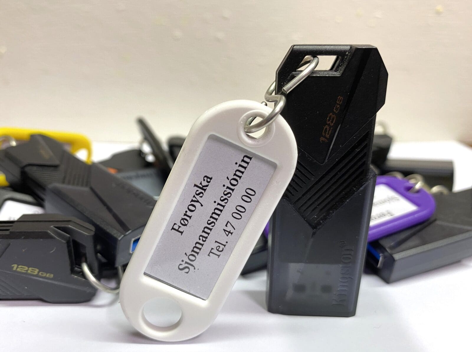 Tað er ein vanligur geymi, sum passar í sjónvørp og teldur. Lyklaringur er hongdur uppí, so fólk síggja, at tað er geymi frá Føroysku Sjómansmissiónini.