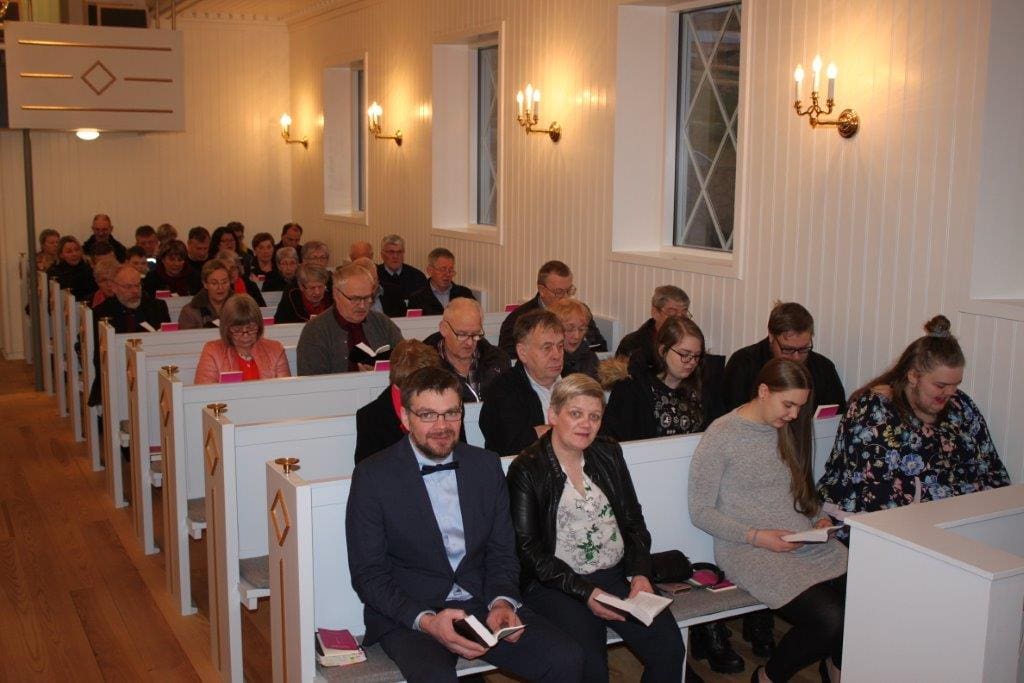 Bergtórur Bjarkhamar, sóknarprestur, prædikaði. Andrias Magnussen, aðalskrivari hjá Heimamissiónini/Sjómansmissiónini, Bergur Debes Joensen, skúlaleiðari í Podas, Jónhard Joensen, stýrisformaður fyri Ørkina, og Marin Elisabeth Poulsen, útitrúboðari, lósu heilsanir úr Skriftini, og síðani varð forbøn fyri Ólavi við handaálegging.