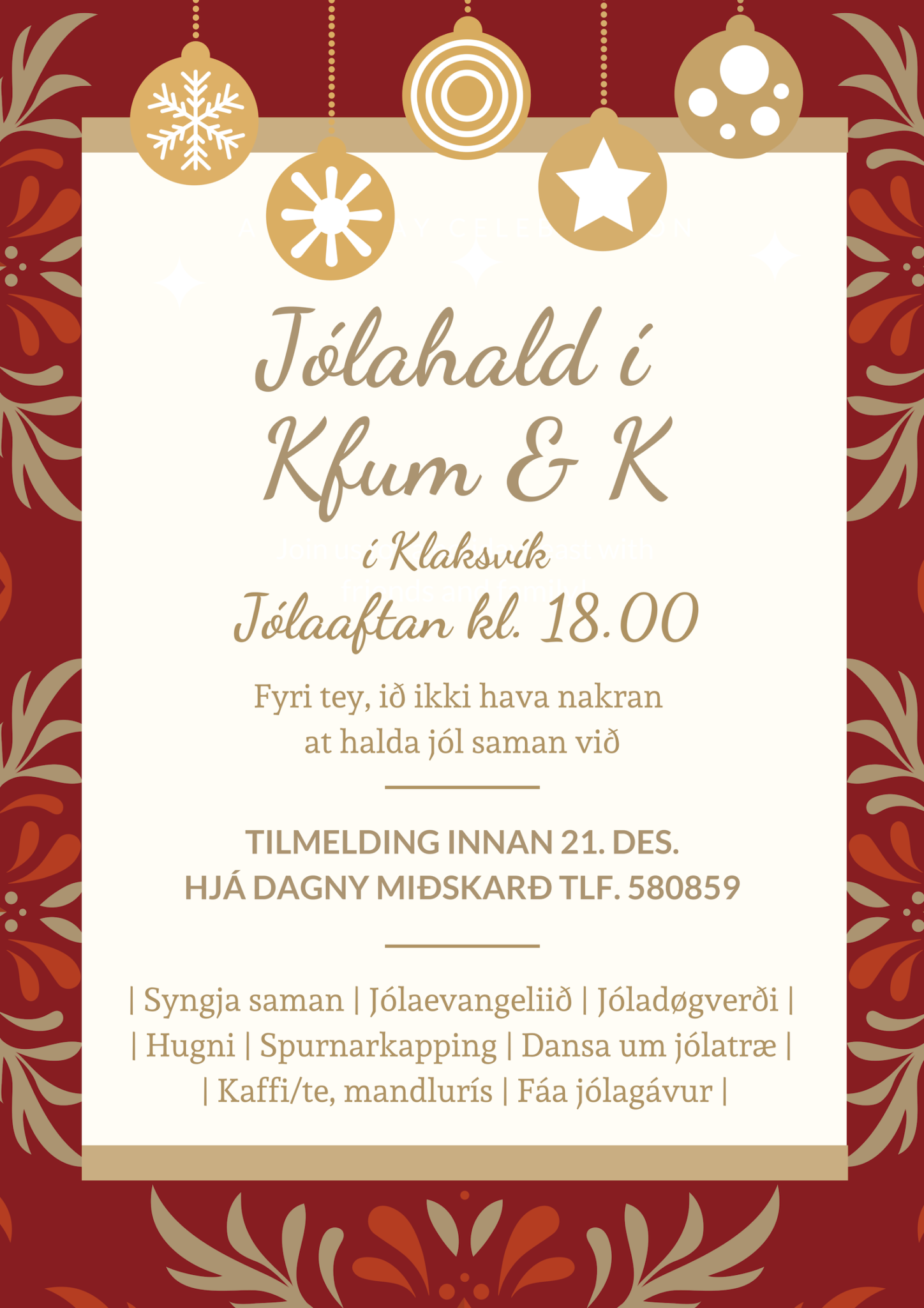 Eins og í KFUK í Havn, verður aftur í ár skipað fyri jólaaftanshaldi í KFUM & K í Klaksvík fyri tey, ið ikki hava nakran at halda jól saman við. Seinastu fimm árini hevur Pól Johannessen, trúboðari, saman við familju síni, skipað fyri jólaaftanshaldinum, men í ár eru tað hjúnini Dagny Miðskarð & Finn Anthoniussen, sum skipa fyri.
