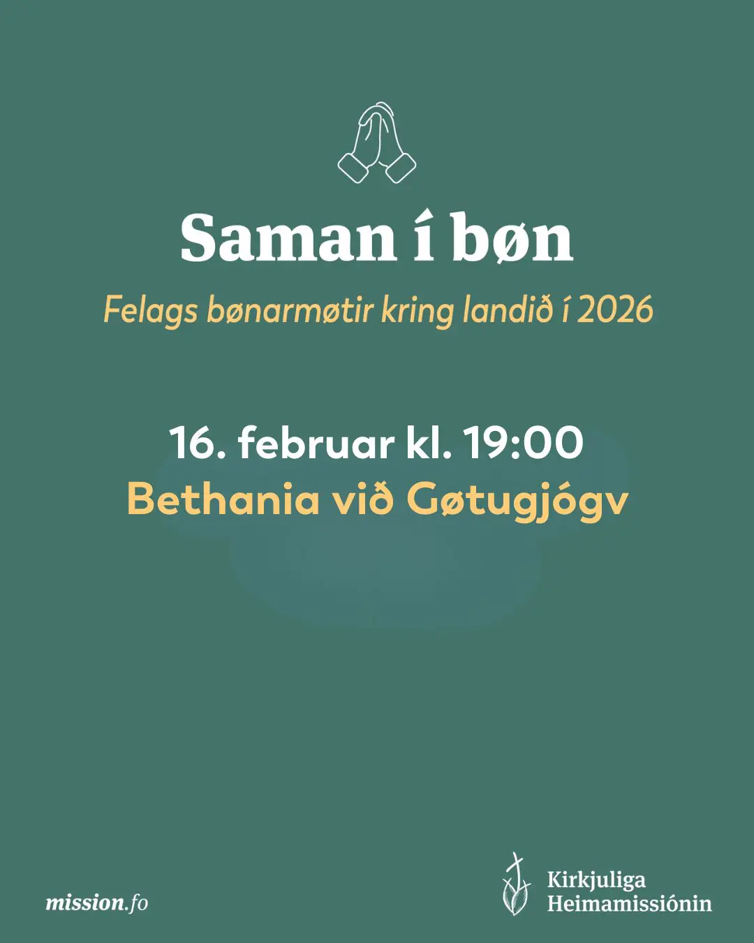 Eftir ætlan skuldi felags bønartiltakið Saman í bøn vera í Leirvíkar Missiónshúsi týskvøldið 17/2. Men av tí at nýggja missiónshúsið í Gøtu varð vígt í dag og missiónsvika byrjar har týskvøldið, er bønartiltakið broytt til at vera í Gøtu mánakvøldið 16/2 ístaðin.
